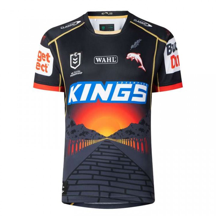 3. Badges brodés : Le maillot arbore les badges des Dolphins et du Championnat Telstra NRL sur la poitrine.
