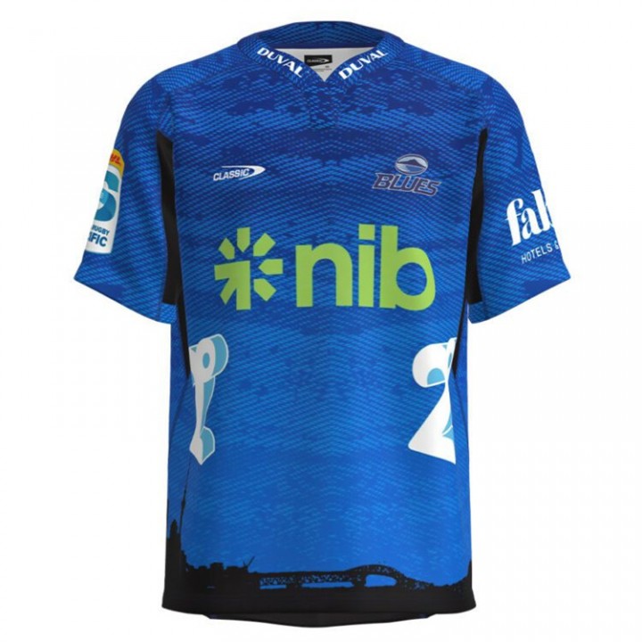 Design Officiel Super Rugby 2024 – Avec les couleurs et les motifs emblématiques portés par les joueurs des Blues.