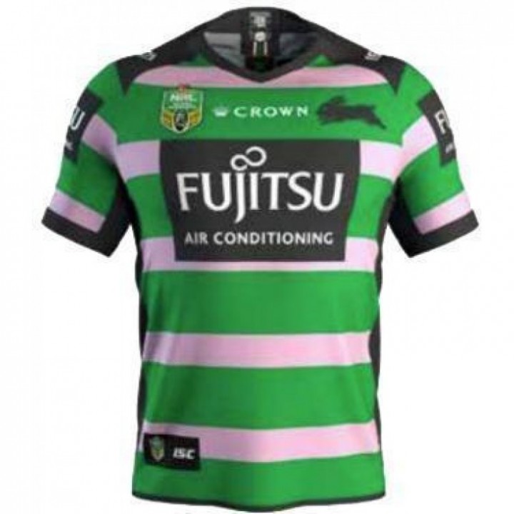 Maillot Rabbitohs 2018 WIL créé pour la Women in League Round avec des bandes roses à la place des traditionnelles rouges.
