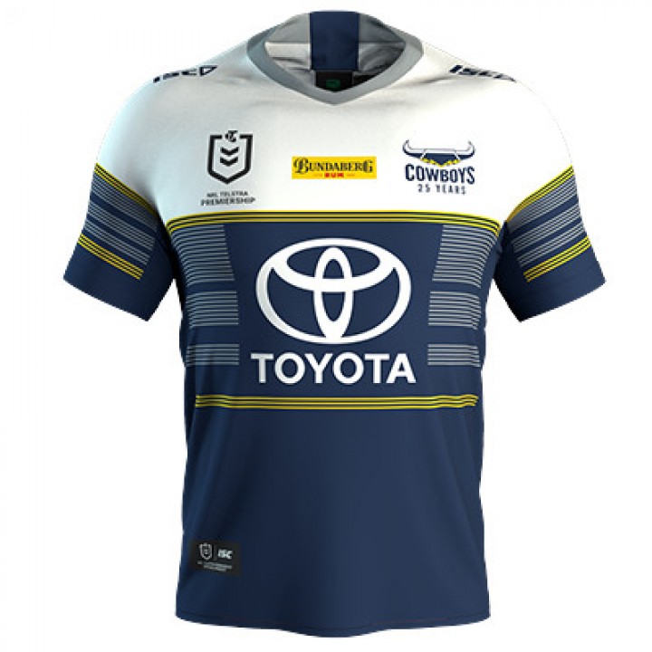 Fully branded chest logos: Cowboys 25‑Year anniversary badge, NRL, ISC, Toyota, Bundaberg Rum and Vantage sponsor emblems.