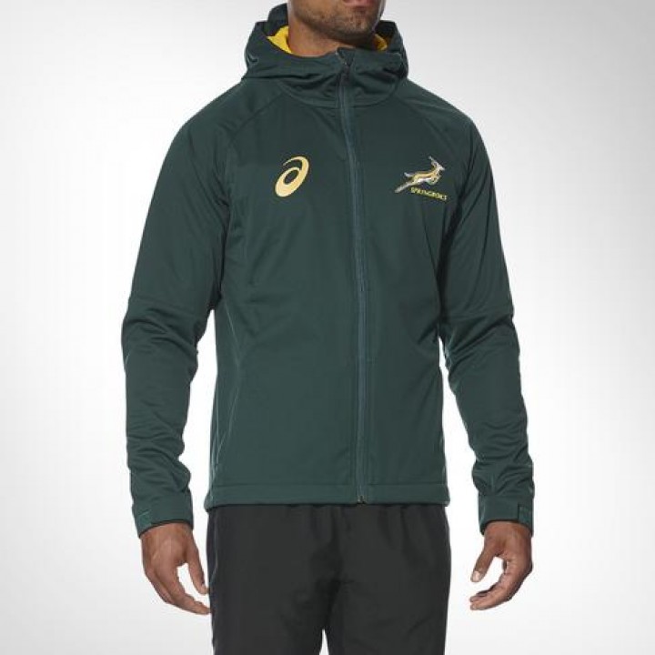 Official Springbok rugby jacket with classic bottle green color and printed team logos for standout supporter pride.