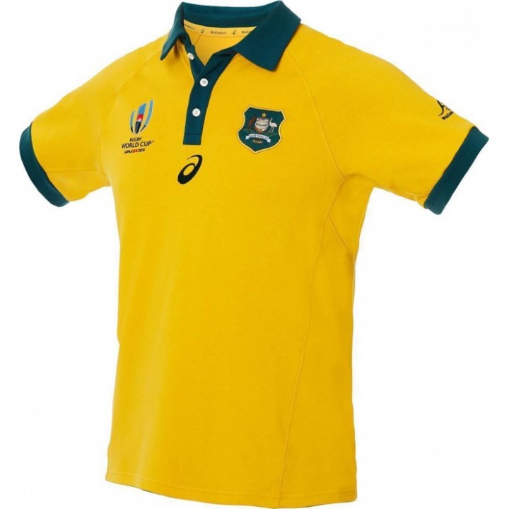 Woven Wallabies badge & Rugby World Cup heat‑transfer logo on chest lend authentic collectible appeal.